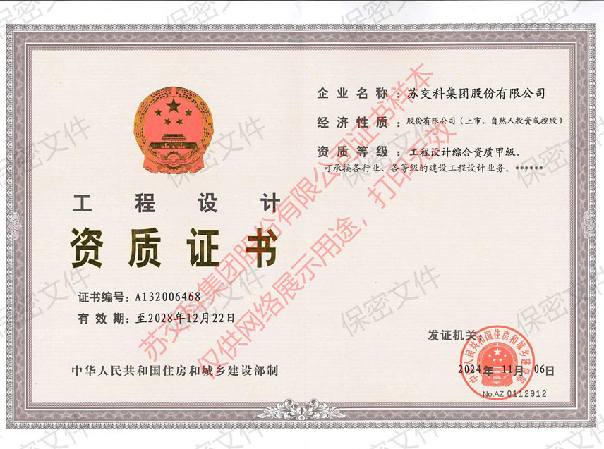 蘇交科擁有工程行業各領域甲級資質,包括城鄉規劃甲級資質;工程咨詢綜合甲級資質;工程咨詢專業甲級資質(公路、生態建設和環境工程、水文地質、工程測量、巖土工程、城市規劃、鐵路、城市軌道交通、港口河海工程、市政公用工程(市政交通、給排水)、水利工程、旅游工程);工程設計綜合甲級資質;工程勘察綜合類甲級資質;測繪甲級資質;公路工程和市政公用工程總承包一級資質;公路工程、水運工程、市政公用工程監理甲級資質;公路工程甲級、公路工程交通工程專項、水運工程材料甲級和水運工程結構甲級試驗檢測資質。